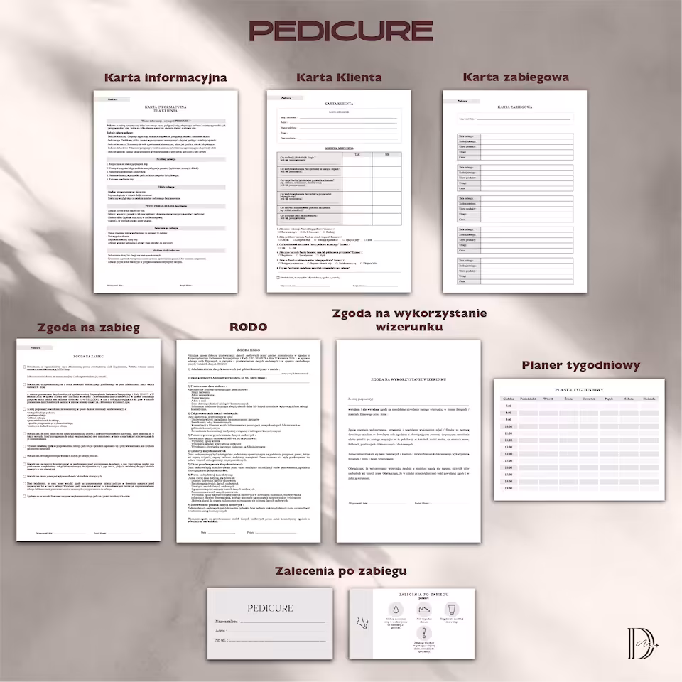 Cały pakiet dokumentów zabiegowych jest profesjonalnie zaprojektowany i łatwy do uzupełnienia. Wszystkie dokumenty są w formacie PDF, co umożliwia łatwe przechowywanie, drukowanie i udostępnianie klientom.