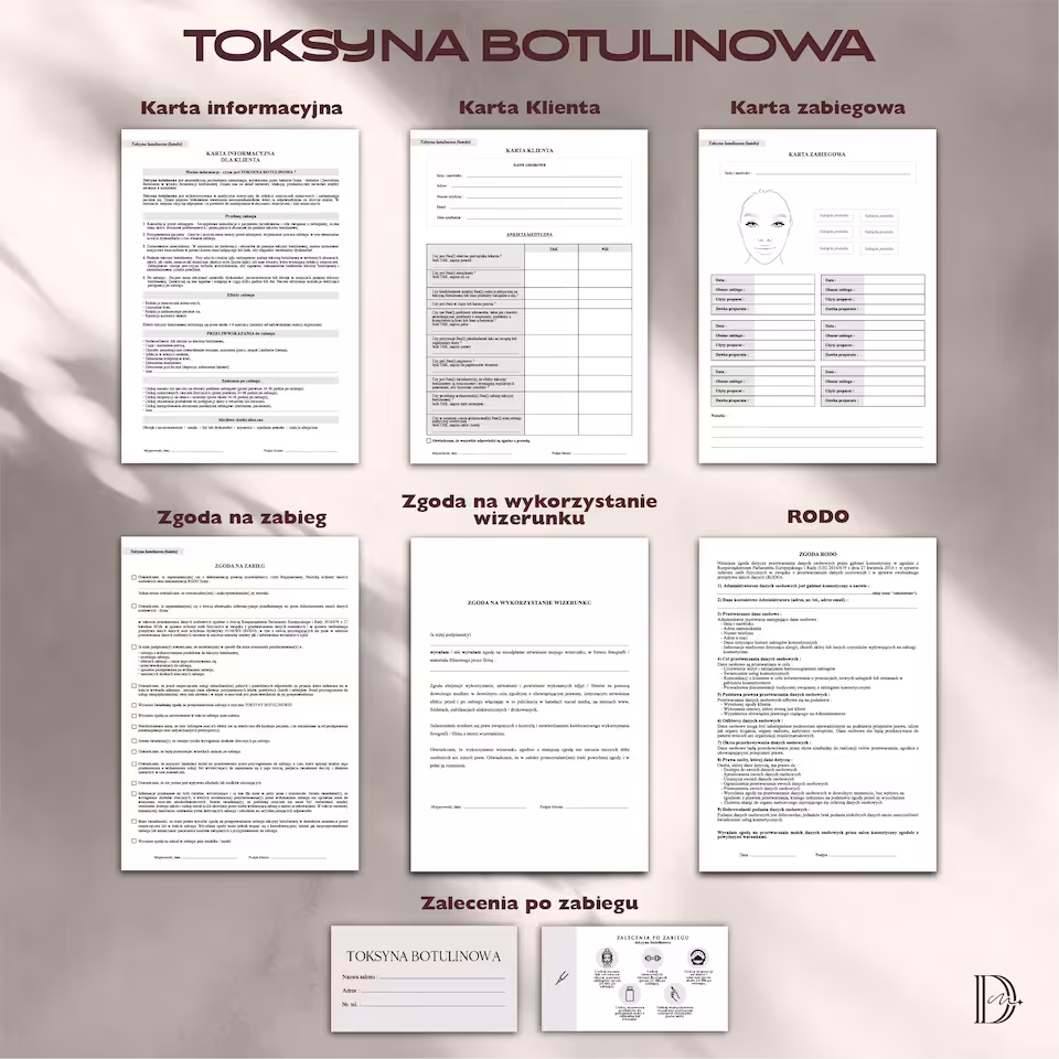 Cały pakiet dokumentów zabiegowych jest profesjonalnie zaprojektowany i łatwy do uzupełnienia. Wszystkie dokumenty są w formacie PDF, co umożliwia łatwe przechowywanie, drukowanie i udostępnianie klientom.