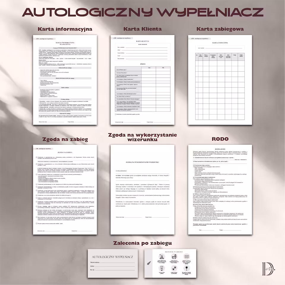 Cały pakiet DOKUMENTÓW ZABIEGOWYCH jest profesjonalnie zaprojektowany, łatwy do uzupełnienia i dostosowany do indywidualnych potrzeb salonu beauty. Wszystkie dokumenty są w formacie PDF, co umożliwia łatwe przechowywanie, drukowanie i udostępnianie klientom.