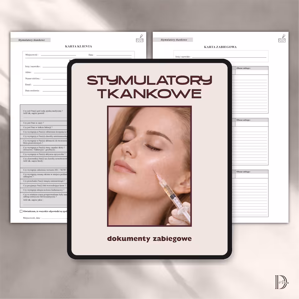 Cały pakiet dokumentów zabiegowych jest profesjonalnie zaprojektowany i łatwy do uzupełnienia. Wszystkie dokumenty są w formacie PDF, co umożliwia łatwe przechowywanie, drukowanie i udostępnianie klientom.